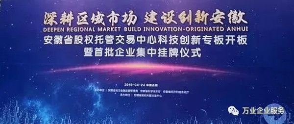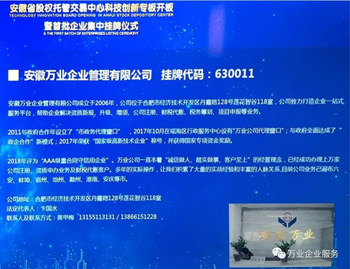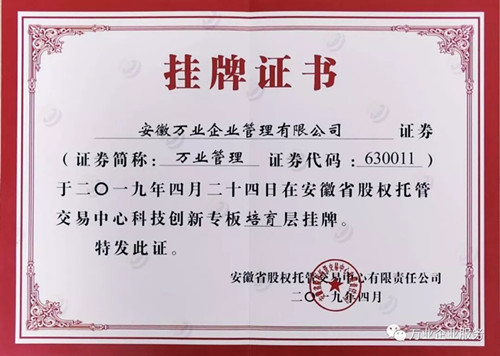 2019年4月24日這一天,安徽萬業(yè)企業(yè)管理有限公司成功入駐安徽省股交中心首批科創(chuàng)板企業(yè),掛牌證券代碼:630011,這是值得被紀(jì)念的一天,是一個新的歷史上的里程碑!